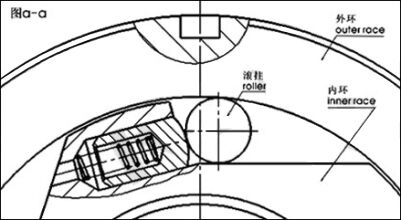 滾柱式單向離合器為外環與內環之間以圓柱形滾子支撐,而內環安裝有彈簧及頂銷,由頂銷產生一個持續 的推力,將滾柱往外擠壓便構成了外環、內環及滾柱的接觸結構如下圖,由于滾柱與內環、外環的接觸為持續不間斷的,故可立即的反應與傳輸扭矩力。此種滾柱型設計堅固耐用、可靠性高,可適用各種應用范圍。例如超運轉速度離合器、定位離合