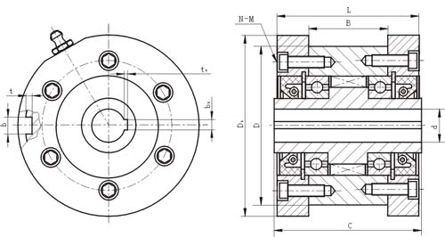 內環與軸,外環與工件,用鍵聯結,用兩端蓋夾緊傳動工件。